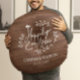 Desenho de almofada redonda de presente de casamento em madeira escura impressa com a frase feliz para sempre em escrita única circulada por folhas de louro simples com nomes e datas de casamento para você personalizar.