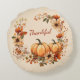 Uma bonito coroa de abóboras e flores do outono em tons de laranja e cores neutras ao redor da palavra "Obrigado".