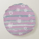 Accent your home with playful rustic charm using the Gingham Orchard Round Pillow. This cozy and whimsical design features vertical brushstroke stripes in soft shades of pink, gray, and blue, layered with white gingham silhouettes of apples and flowers. The combination of painterly textures and classic gingham patterns creates a nostalgic yet modern feel — perfect for nurseries, living rooms, or gifting.