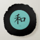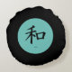 O travesseiro decorativo redondo apresenta um símbolo de caligrafia kanji japonês simples para Paz em aqua round.