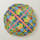 Padrões geométricos vibrantes enchem a imagem, apresentando círculos, triângulos e espirros em um caleidoscópio de cores que incluem azul, verde, amarelo e vermelho. A intrincada design cria um sentido de simetria e equilíbrio.