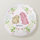 Sweet Light Pink Bunny Wreath Round Pillow featuring two floppy ear bunnies in a delicate bud wreath. Personalize with your little girl's name. Perfect for little girls' bedroom or nursery chair. Make a nice baby shower gift, first birthday gift, Easter gift, or just freshening up a room decor.