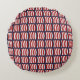 Travesseiro decorativo redondo com um padrão de vaivém a vermelho e branco sobre fundo marinho. O verso é azul marinho sólido.