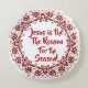 Belo travesseiro decorativo redondo com fronteira floral de ornamentado vermelho, exibido com o ditado: "Jesus é a razão da estação!" Esta travesseiro decorativo será uma exibição incrível para sua casa durante o feriado de Natal!