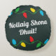 Um design de natal irlandês feliz em um travesseiro redondo. Diz "nollaig shona dhuit" que significa "Feliz Natal para você."