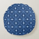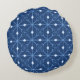 Travesseiro redondo de inverno com um padrão de flocos de neve e cristais de gelo em azul claro e branco sobre fundo azul escuro.