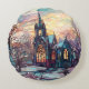 Um travesseiro redondo encantador com a imagem de uma igreja de inverno em estilos de vidro manchado.