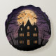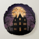 Adicione um toque assustador à sua casa com este travesseiro redondo de casa assombrado de Halloween. A misteriosa lua de cheio, árvores escuras, e morcegos circulando uma mansão assombrada criam um design na moda arrepiante. Perfeito como decoração sazonal para o seu sofá, cama ou configuração de festas de Halloween. Um presente de excelente para quem ama o Halloween!