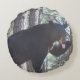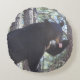 Um travesseiro redondo com uma foto de um urso preto.