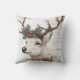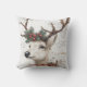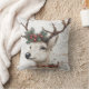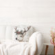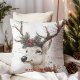 Este travesseiro decorativo festivo apresenta uma ilustração rústica de uma rena com um pinho e uma coroa de morango vermelha em suas galhadas. O plano de fundo tem um aspecto antigo, texturizado com script manuscrito, e "Feliz Natal" é exibido em negrito texto vermelho. Perfeito por adicionar um toque de feriado aconchegante à sua época de Natal.