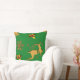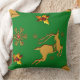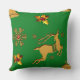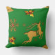 Um travesseiro de Natal festivo, com renas ouros, ouro, sagrado, com rubis vermelhos para as bagas, flocos de neve ouro e estrelas contra um fundo festivo, tradicional, verde de Natal, para acrescentar um olhar colorido e festivo ao seu decoro natalino nesta época festiva.