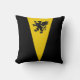"Acalme-se, numa pilha ou numa mesa de grifo." A parte de trás do travesseiro é um padrão em cores coordenadas.