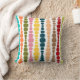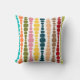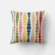 Este travesseiro decorativo tem um design moderno século médio de linhas verticais de retângulos arredondados em tamanho crescente e decrescente em cores retrorreflectoras de vermelho, verde, azul, amarelo, laranja e marrom em um campo de branco.
