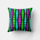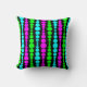 Este travesseiro decorativo tem um design moderno do século médio de retângulos rochosos, verdes e azuis, de neon, em tamanho crescente e decrescente, correndo verticalmente num campo de preto.