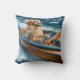 Um recuperador de ouros caminha alegremente ao leme de um barco a motor de madeira vintage em alta velocidade num lago azul instável.