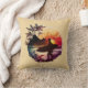 Este travesseiro decorativo é perfeito para um surfista. Está no estilo retrô, apresentando uma cena de praia no pôr do sol de um surfista com pranchas de surfe em primeiro plano.