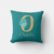 O travesseiro decorativo bonito apresenta a letra "O" dourada com rosas aqua e buquê floral dourado sobre fundo lacrimogêneo. Personalize com o nome na fonte dourada.