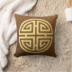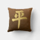 A frente de travesseiro tem o símbolo asiático de riqueza, prosperidade e sorte com a aparência de ouro emboscado em couros de pele castanha. As costas têm a caligrafia pela paz no mesmo aspecto dourado gravado.