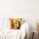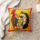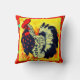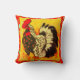 Colorful rooster art throw pillow with red decorative background.