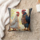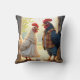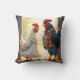 Um galo e galinha vestidos de roupas humanas ficam diante um do outro com um ovo entre eles, dentro com filtro de luz solar