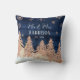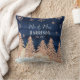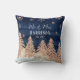 "Almofada Mr e Mrs Rosa Dourado Naval com Brilho Floresta de Inverno." Fundo de madeira em azul naval rico lavado com tinta aquarela com árvores da floresta em rosa e brilho dourado sobre uma colina nevada com três cervos e flocos de neve estilizados. Todas as obras de arte criadas pela artista e designer licenciada internacionalmente, Audrey Jeanne Roberts, direitos autorais reservados.