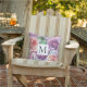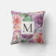 Rosas de aquarelas e travesseiros florais monogramas ao ar livre. Mostra um padrão de rosas de safra em roxo e coral e seu monograma em um quadro branco.