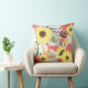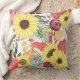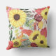 As imagens em aquarelas de girassóis dourados e rosas marrom e rosa se combinam para formar um bonito interior neste travesseiro decorativo colorido. Junto com as imagens das flores, estão as folhas verdes e violetas e lavandas. As imagens são colocadas sobre um fundo branco. Ambos os lados do travesseiro têm o mesmo design.