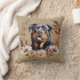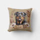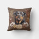 Um belo retrato de um majestoso cão rottweiler é colocado no centro de uma coroa de outono em tons de cinamão marrom, bronzeado e creme. O cão e o design da coroa são colocados sobre um fundo castanho mais claro. Ambos os lados do travesseiro têm a mesma imagem, mas o reverso tem um fundo castanho mais escuro.