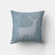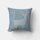 Um travesseiro quadrado com um fundo de madeira azul. Camadas sobre o topo é uma silhueta de uma rena com grandes galhadas.