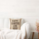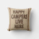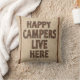 Um grande travesseiro decorativo para sua cabine ou para alguma decoração rústica. O tecido do saco da farinha do olhar naturalmente com os campistas felizes das palavras vive aqui. A parte traseira tem o mesmo olhar do tecido com um grande cone do pinho no centro. Este é um tecido do saco da imagem digital e não realmente da farinha