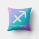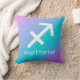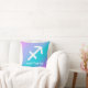 Um travesseiro decorativo chic com o símbolo astrologico do Sagitário sobre um fundo de gradiente azul e roxo. Para alguém que faz aniversário entre 22 de novembro e 21 de dezembro.
