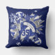 O travesseiro decorativo de vôlei desta garota divertida apresenta uma "explosão" de vários vulicões azuis e brancos e cinzas e estrelas brancas em um fundo azul mais escuro e personalizável - os painéis azuis dos volleybolas são misturados com um padrão caleidoscópico floral e giro - personalizam com o nome do atleta e o número de camisa na frente e atrás - katz_d_zynes