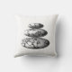 Um design simples, limpo, estético de Zen com três pedras lisas, ovais, dispostas em uma pilha vertical, com a maior pedra no fundo, uma pedra média no meio, e a menor pedra no topo, criando uma imagem de equilíbrio perfeito de Zen.