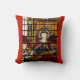 Travesseiro decorativo adorável apresenta janela de vidro colorido do Santo Cecilia - o santo protetor da música, com órgão de pipe e cherub/criança segurando harpa em fundo vermelho