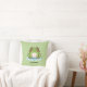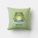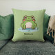 Um travesseiro verde com uma ilustração de um sapo bonito em seu lago e texto personalizável abaixo! Perfeito para adicionar um toque engraçado ao quarto de uma criança!
