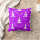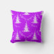 Um travesseiro decorativo de Natal roxo, colorido, com um padrão de árvores de Natal modernas, de cor branca, contra o fundo roxo, com a saudação "Seja Feliz" repetida. Esta almofada faria um excelente de decoração para a decoração de Natal deste ano.
