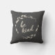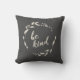 Na moda e travesseiro decorativo minimalista com a citação inspiradora de bondade - Seja gentil - em belos escritos, com a letra dentro de uma coroa floral moderna em creme, num fundo negro.