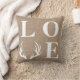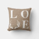 A serapilheira rústica do falso e o travesseiro decorativo branco dos antlers dos cervos com a palavra "AMAM" onde os antlers representam o "V". A parte traseira tem os antlers e as iniciais e a data estabelecida do casal.