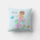 Uma divertida, colorida, crianças sereia travesseiro decorativo com uma sereia bonito na sua roupa de bolinhas nadando com peixes coloridos entre as flores e as bolhas de água; tão fofo. Adorável para uma creche ou um quarto para crianças; um favorito com meninas.
