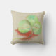 O trabalho de arte pastel decorando esse travesseiro decorativo retrata uma pedra verde de champanhe com sotaques de laranja enferrujada criados em um fundo de papel neutro.