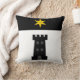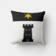 "Argent, uma torre e em uma esquadra, um estojo ou." A parte de trás do travesseiro é um padrão medieval em cores de coordenação.