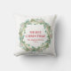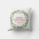Elegante travesseiro decorativo de Natal com "Feliz Natal" junto com seu nome familiar e ano em vermelho, cercado por uma coroa verde. Este travesseiro decorativo de Natal certamente adiciona um toque festivo à sua decoração de Natal.