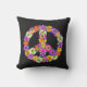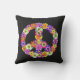 Um sinal de paz floral em tons cor-de-rosa, amarelo, laranja, roxo, verde, branco e preto constitui a peça central neste travesseiro decorativo gráfico boho.