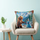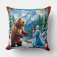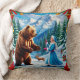 Uma paisagem de inverno mágica com uma donzela de neve vestida de vestido azul interagindo com uma cerveja. Montanhas cobertas de neve e decorações festivas fortalecem a atmosfera sazonal e pacífica.