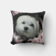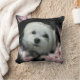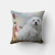 Este coxim ou travesseiro bonito caracterizam Snowdrop, um cão maltês pequeno doce. Mostras uma laterais seu retrato que é contido dentro de uma criação artística de flores cor-de-rosa e do laço preto que dão à imagem um efeito incomum e dramático. No outro lado está sentando-se entre algumas flores cor-de-rosa bonitas do cosmos com uma brisa macia do verão que funde sua pele branca de seda longa.