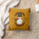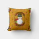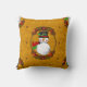 Uma almofada de Natal gira com a imagem de um boneco de neve rodeado por uma fita de ouro e de Natal vermelha com flores sagradas e poinsettia sobre um fundo decorativo de ouro.