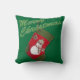 Uma fotografia de uma meia vermelha e verde com um adorável boneco de neve vestido com um lenço de xadrez sazonal e um chapéu colocado sobre um design de fundo verde está no cobrir de ambos os lados deste travesseiro decorativo. Deixe-o como está ou clique em Personalizar para adicionar texto como um nome de família ou uma cotação. Em personalizar, você também pode selecionar uma cor de fundo diferente de verde em ambos os lados.