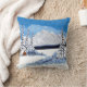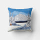 Um travesseiro decorativo com uma bela cena de inverno, incluindo montanhas nevadas, cabana rústica e neve cobria todos os vergreens. O texto pode ser personalizado ou excluído. Arte original por W.B.