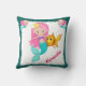 Uma doce e pequena travesseiro de sereia com uma bonito sereia de cabelo rosa e seu peixe-dourado, duas pequenas sereias menores com cabelo cor-de-rosa nos cantos superiores, uma "areia" lacrimogênea e uma opção para personalizar com o nome do seu filho no canto (nota, o texto pode ser removido também se desejar.) Essa almofada de sereia bonitinha faria uma adição ideal ao berçário de um bebê, um quarto de garotinha, faria um presente personalizado de chá de fraldas excelente, ou decoração para uma festa de aniversário temática de sereia.