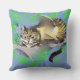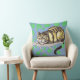 Este design mostra meu sorridente Gato Cheshire baseado na ilustração original de preto e branco de Tenniel, em uma árvore contra fundo azul, com folhas verdes. A parte de trás da almofada mostra o Gato de Cheshire desaparecendo.